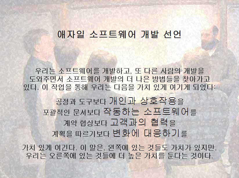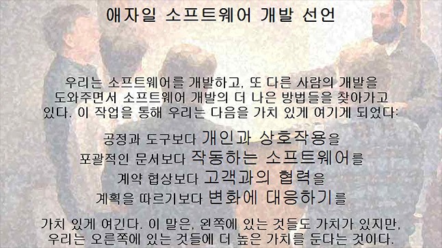 2001년 2월, 변화의 움직임이 싹텄다. 17명의 소프트웨어 개발자가 ‘애자일 연합’을 결성해 좀 더 빠르고 유연한 개발 방식을 논의하기 시작한 것이다. 이들은 애자일 소프트웨어 개발이 무엇인지 정의하고, 애자일 소프트웨어 개발을 장려하기 위한 여러 활동을 시작했다. 당시 애자일 연합에서 선언한 내용은 다음과 같다.