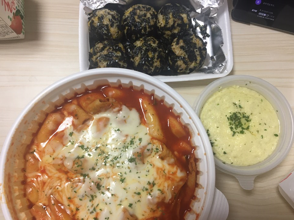 기본 메뉴인 치즈 떡볶이에 주먹밥과 당면을 추가해서 먹을 때... 잊지 못한다