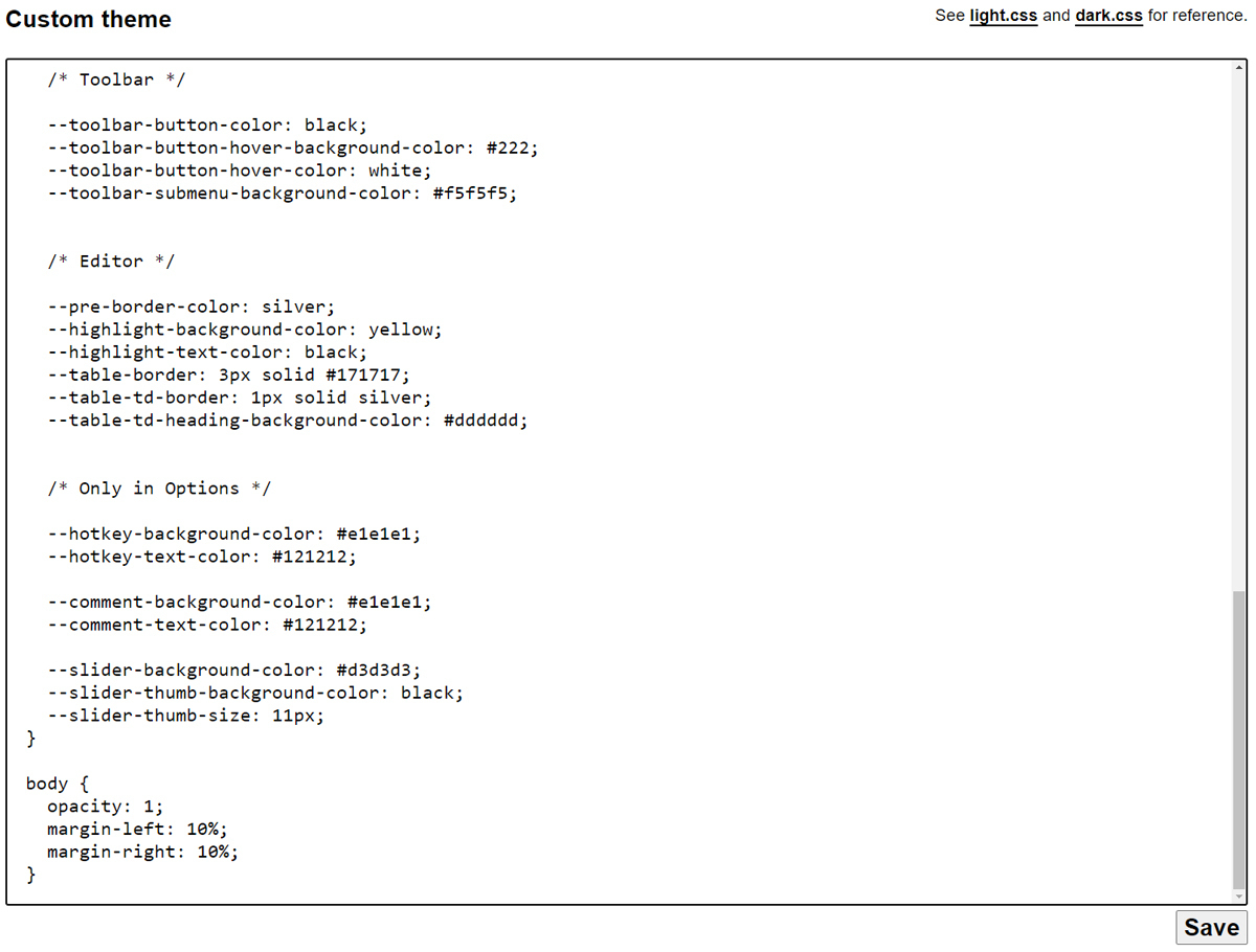 마이 노트에 포함되어 있는 다른 옵션으로는 기본 폰트, 크기, 테마 변경 등이 있다. 라이트 테마와 다크 테마가 기본 탑재되어 있고, CSS 기반의 스타일시트로 완전히 맞춤 설정도 가능하다.